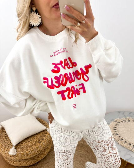 Bluza damska oversize z napisem Love Yourself First w kolorze kremowym
