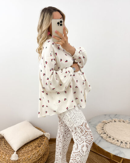 Koszula w wisienki biała oversize z wiskozy prezentowana przez młodą kobietę