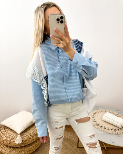 Koszula Damska w Paski z Koronką Niebieska