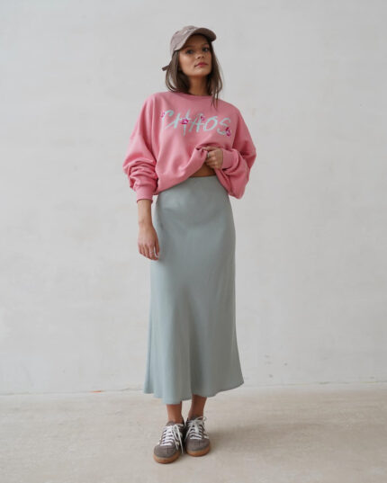 Różowa bluza overisze z napisem CHAOS prezentowana przez młodą dziewczynę
