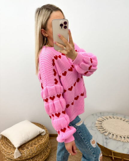 Różowy sweter w serduszka oversize prezentowany przez młodą dziewczynę