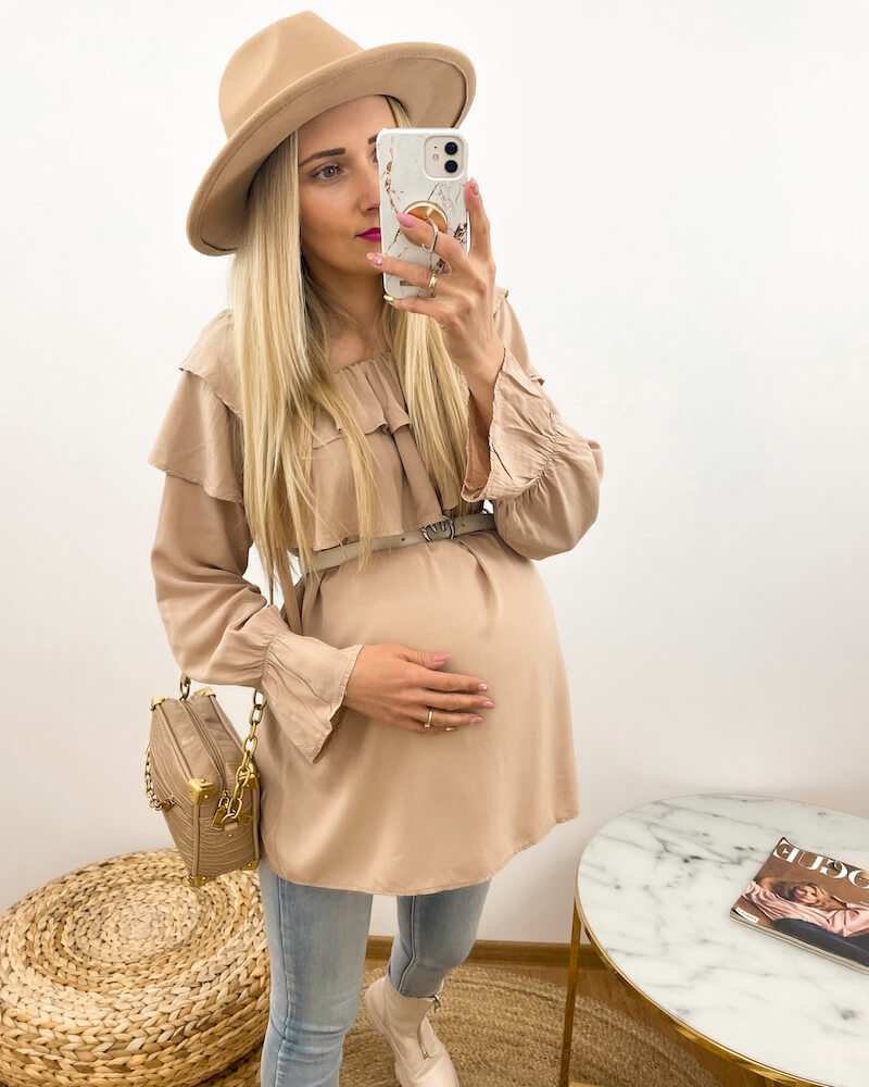 Beżowa bluzka ciążowa hiszpanka z podwójną falbana przy dekolcie. Rękawy długie z delikatną gumeczką, która daje możliwość regulacji długości. Fason luźny, materiał bardzo zwiewny, wykonana ze 100% wiskozy. Ta bluzka świetnie sprawdzi się do spodni lub legginsów. Polecamy w wersji na pół sportowo z trampkami i torebką listonoszką przez ramię jak i na elegancko do jesiennego płaszczyka oraz butów na obcasie. Załóż do niej cienki paseczek by podkreślić ciążowy brzuszek. Zobacz pozostałe kolory z tego modelu.