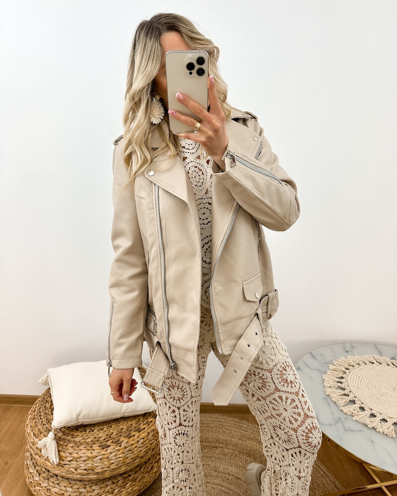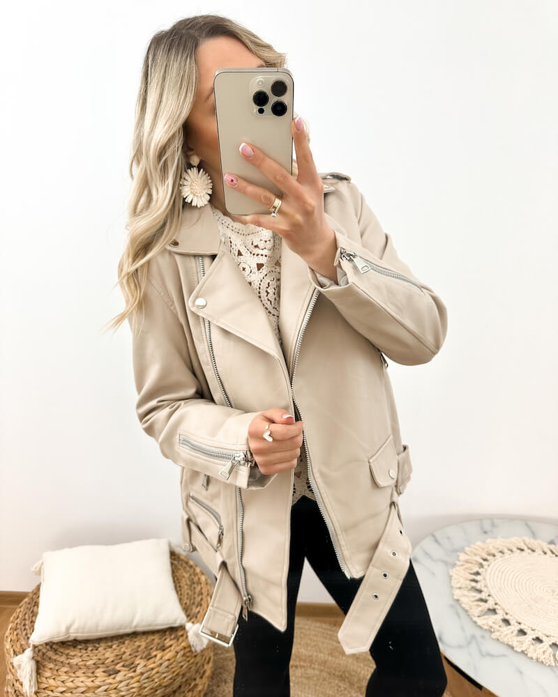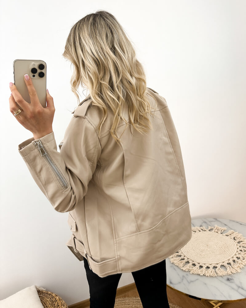 Beżowa Ramoneska Damska Oversize z Ekoskóry