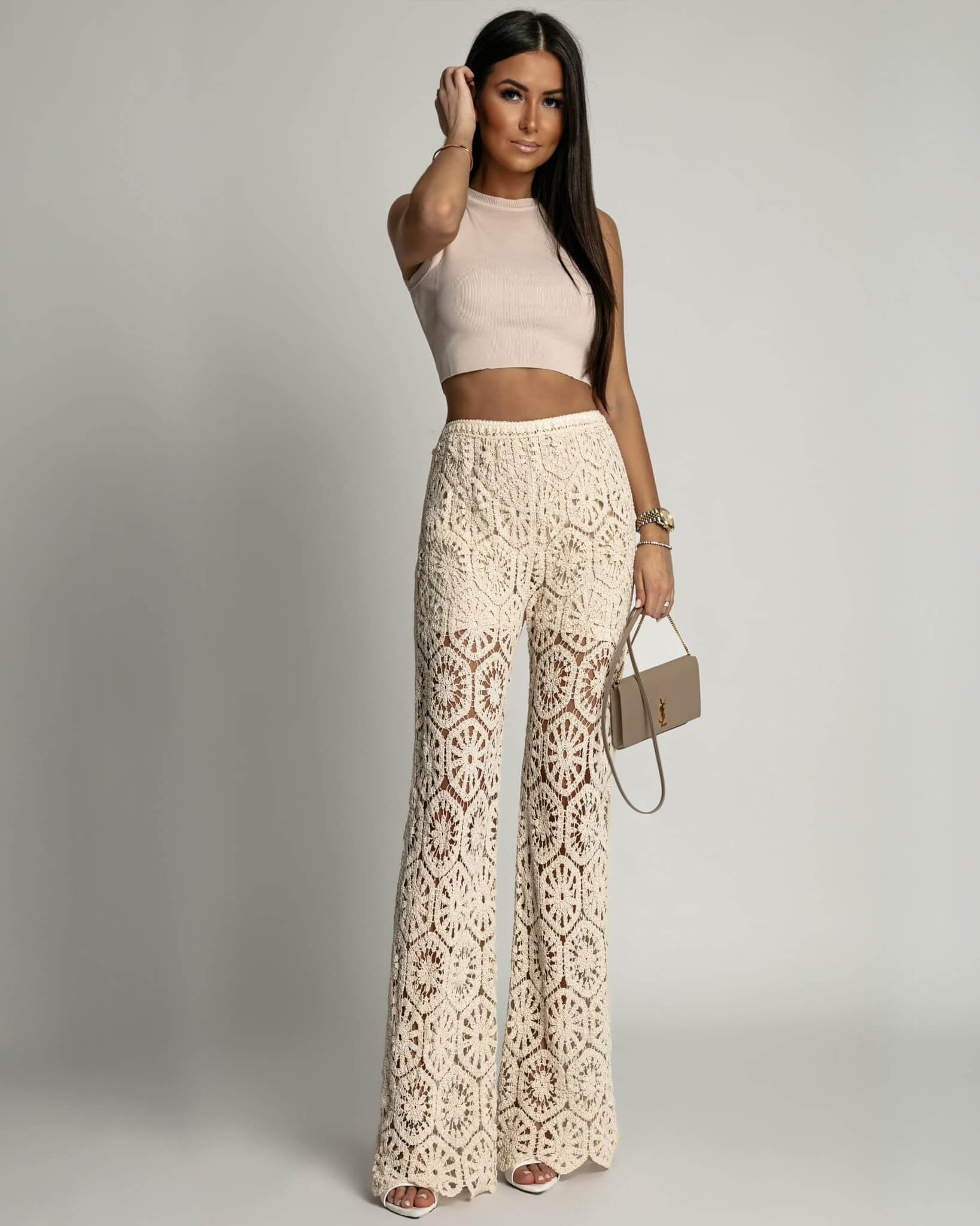 Beżowe Spodnie Ażurowe Boho Typu Dzwony