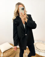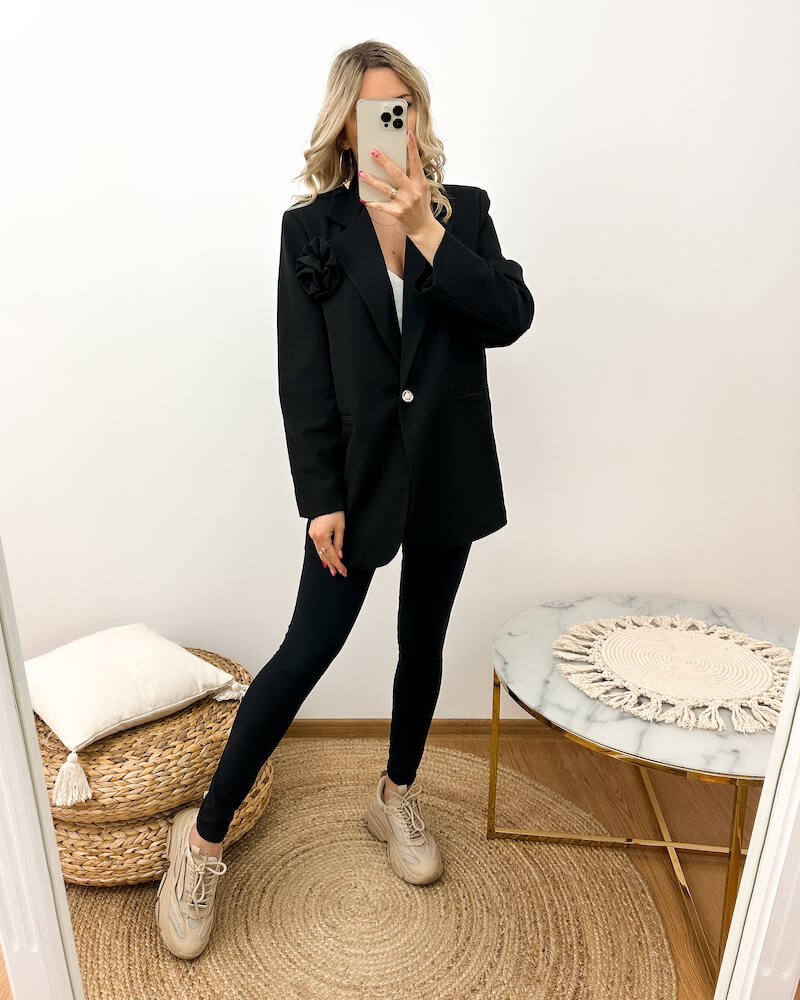 Czarna marynarka z różą 3D to kwintesencja kobiecości i elegancji. Wyjątkowy fason oversize sprawia, że model ten pasuje na rozmiary S, M i L, gwarantując wygodę noszenia oraz swobodę ruchów. Zapinana na jeden guzik nadaje całości subtelny charakter. Niezwykły detal tej marynarki to przodu umieszczona broszka w kształcie trójwymiarowej róży 3D, dodająca uroku i oryginalności. Co istotne, broszka jest odpinana, co daje możliwość dostosowania stylizacji do własnych upodobań.