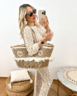 Koszyk plażowy w kwiaty boho to połączenie naturalnego a zarazem oryginalnego stylu. Wykonany z trawy morskiej, nasz koszyk emanuje letnią energią i świeżością. Solidne rączki obszyte materiałem oraz jutą zapewnią wygodne noszenie. Ozdobiony kwiatami z muszelek i frędzlami, prezentuje się niezwykle efektownie i oryginalnie. Wnętrze koszyka wyściełane jest miękką bawełnianą wyściółką. Zapięcie na suwak pozwala na bezpieczne przechowywanie Twoich drobiazgów, a jednocześnie łatwy dostęp do nich. Wybierz nasz słomkowy koszyk plażowy, aby cieszyć się nie tylko wyjątkowym stylem, ale także praktycznością podczas letnich eskapad! Koniecznie zobacz inne modele torebek plażowych.