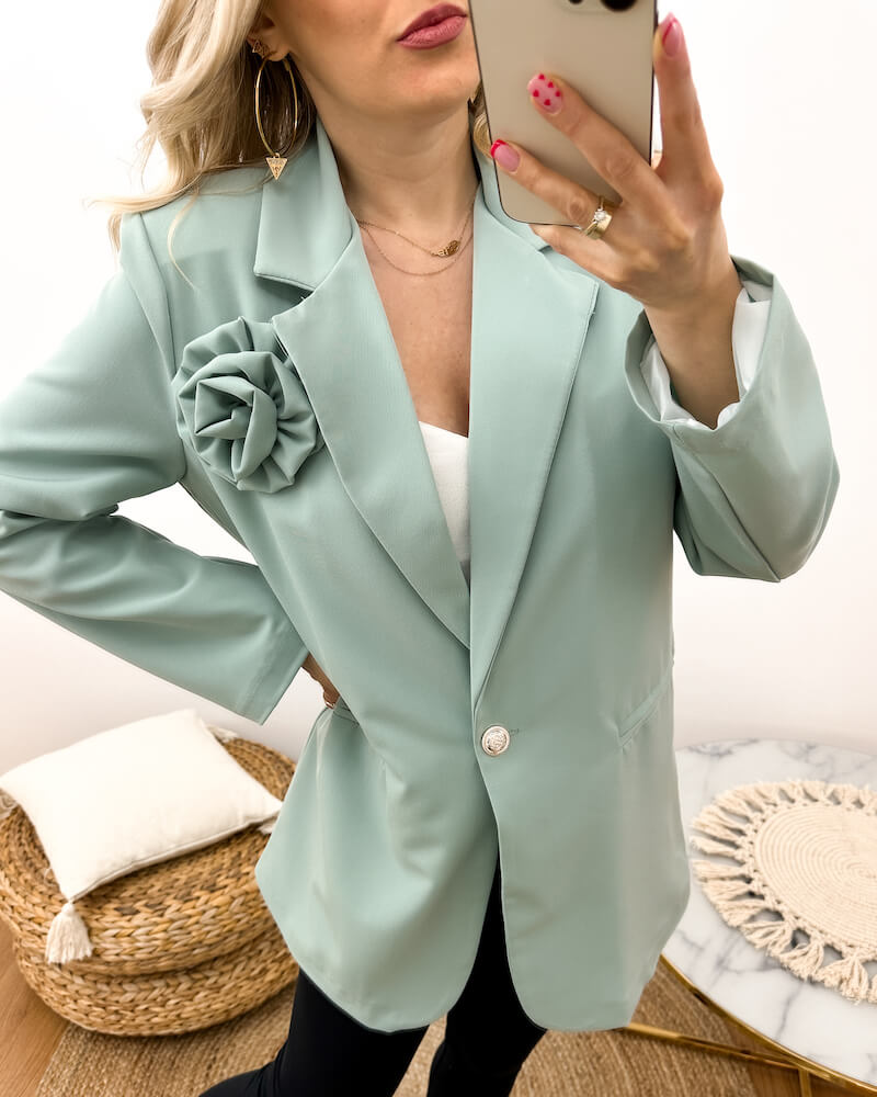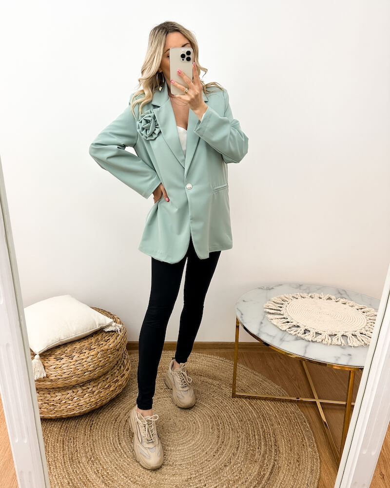 Miętowa marynarka z różą 3D – styl i elegancja w nowoczesnym wydaniu! Dzięki fasonowi oversize, pasuje na rozmiary S, M i L, zapewniając komfort noszenia i swobodę ruchów. Zapinana na jeden guzik, emanuje delikatnością i świeżością. Dodatkowy atut to trójwymiarowa broszka w kształcie róży 3D umieszczona z przodu, która nadaje całości niepowtarzalny charakter. Co istotne, broszka jest odpinana, co daje możliwość personalizacji stylizacji. Koniecznie zobacz inne modele marynarek dostępnych w naszej kolekcji.